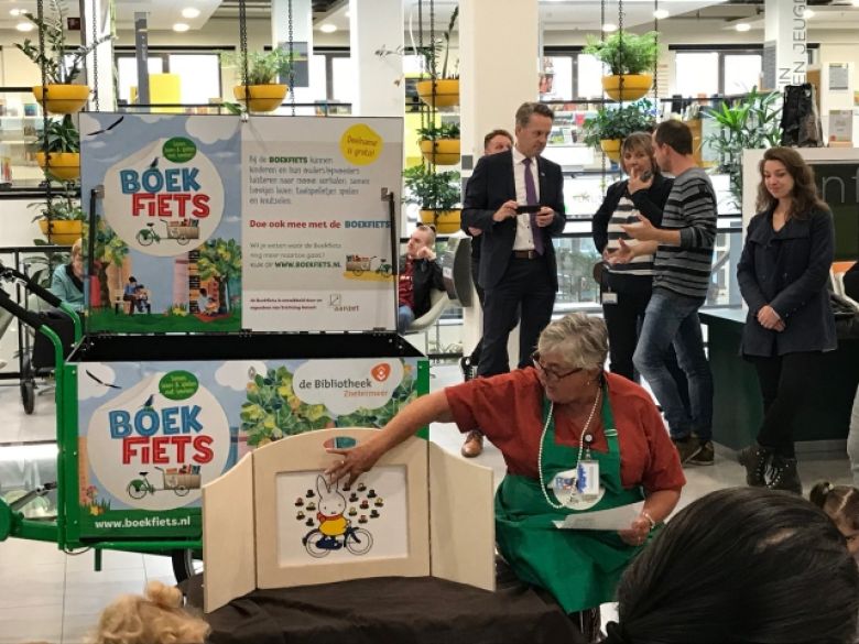 Sinds vrijdag 18 november rijdt de Boekfiets ook in Alkmaar! Voor de feestelijke lancering van de Boekfiets, heeft wethouder onderwijs, Ad Jongenelen, het laatste stukje naar de locatie gefietst. Waarop Mister Anansi, meesterverteller, de feestelijkheden heeft geopend met een speciale (lees)voorstelling...